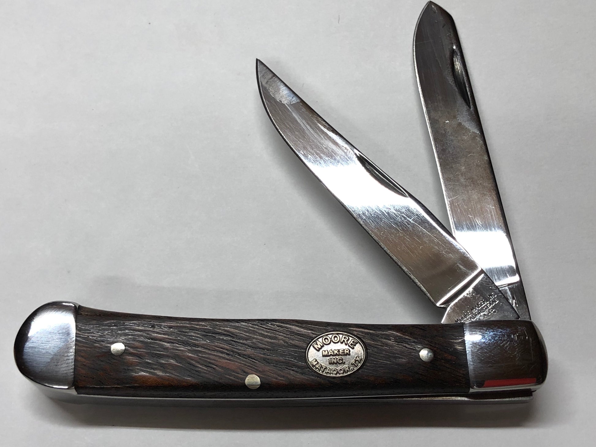 Mooremaker Mesquite Handled Trapper model 5202bd’a length 4 1/8”, grain pattern will vary, individually boxed, always in limited supply, no serial number